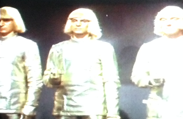 Set sometime in the far future, an alien race of Edgar Winter clones deactivate one of Earth’s defense satellites as a distraction in order to kidnap a moderately unhinged geneticist and his eye-candy assistant, Lois, to help save their planet. The Winters are all dressed in the same armorless, gold lamé track suits and carry flashlights as weapons. They call them “guns”, but it’s still a flashlight.