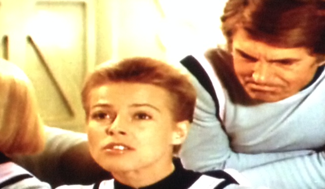 The Professor presses a button on the console, disabling their light blasters. See? Told you those things were awesome. This, however, has no effect on the light swords that the Winters try to fight our heroes with. Kuba does a flying kick and knocks a sword free, which he tosses to John. This somehow means that everyone involved now gets a sword. The battle ends when Don Sutton & one of the superfluous blonde female crew member “extras” (who were on the ship) are brought out at gunpoint. Lightpoint? Whatever. The Professor threatens to kill them unless the fighting stops. This threat may have been more effective had the fighting not already stopped.