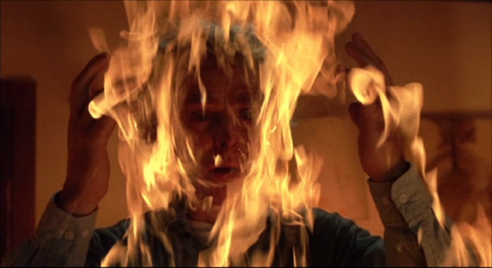 During the next group session, Cynthia has a flashback of the night of the fire. Harris is performing the dousing ceremony, only this time it’s quite evident that he is using gasoline and not water. The only “unity” in this ceremony is the “unity” of death. He douses more of the women, then splashes his own face before pouring the remainder of the gasoline on the house floor. He strikes a match and lights it all up, the cult members each covered in flames. The effect is low-budget, yet still looks far superior to similar CG effects done today. To make the scene (as well as the fate of the lost souls within) a little sadder, a couple of kids do go up in flames, and a baby can be heard in the background. Lynch, now acting as a present-tense entity, tells her that the clan can not “cross over” until she has joined them.