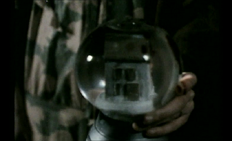 A woman inside the house is attempting to barricade the door against the wind that is whipping outside. Voices can be heard on the wind, voices that aren’t quite human. She turns from the door to see her husband, the man looking almost hypnotized. She asks him if he has brought her daggers. He answers her by puking some ready-whipped topping on her. She backs away from him as boils start to grow on his hands and face. His chest bulges and he starts to grow fangs. As he closes in on her, she grabs a snow globe from a nearby counter, which soon falls to the ground. As it shatters, the whole damn house explodes. Rosebud. Muthafuckin’ Rosebud.