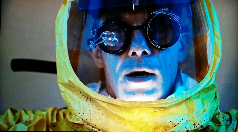 Barry’s daughter alerts he and his wife to a stranger in their kitchen. They dispatch the zombie invader and flee the house. There must have been some sort of previous outbreak. That, or Barry is a survivalist who is just readily prepared for the apocalypse because they leave the house wearing gas masks and armed with nail guns and other household tools to use for defense. The family manages to reach the car and drive away without being bitten, but the contagion is soon revealed to be airborne when Barry’s wife and daughter start to “turn” regardless. I’m less than 600 words into this review, so I still don’t feel that I spoiled anything by telling you that Barry kills them.