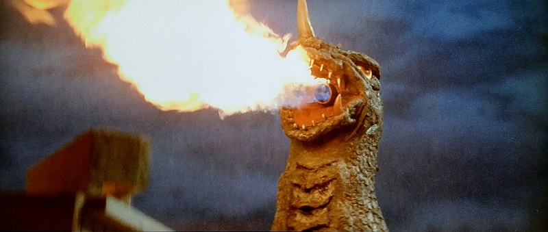 As far as kaiju monsters go, Yongary is one goofy looking critter. The construction of the creature suit is not quite on par with those found in the Godzilla films. If anything, it’s much closer to the quality of some of Gamera‘s monstrous foes. One of Yongary’s defining features is that there is almost no attempt made to camouflage the nozzle of the flame thrower concealed in the creature’s mouth. There’s a strong sense that someone was happy enough getting the thing to work without setting the suit on fire. Aesthetics were secondary.