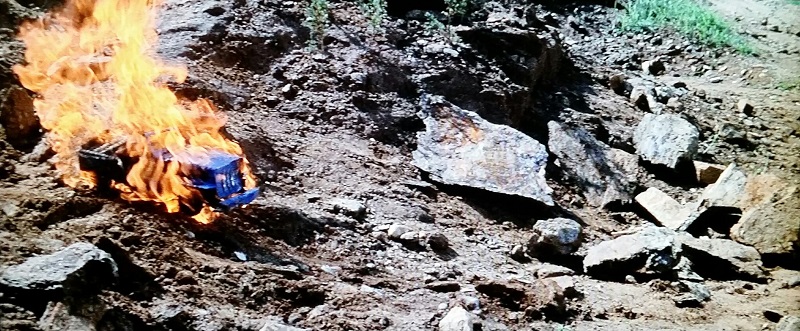 The detonation of the bomb causes the command center to lose communications with the space capsule. The detonation also rips a large trench in the ground, which in turn starts a series of earthquakes that are now moving towards South Korea. “Earthquake” is the keyword here because even though we see a toy plane drop a toy bomb, the nuclear testing in not mentioned again. The consequent series of events in continuously attributed to the earthquakes.