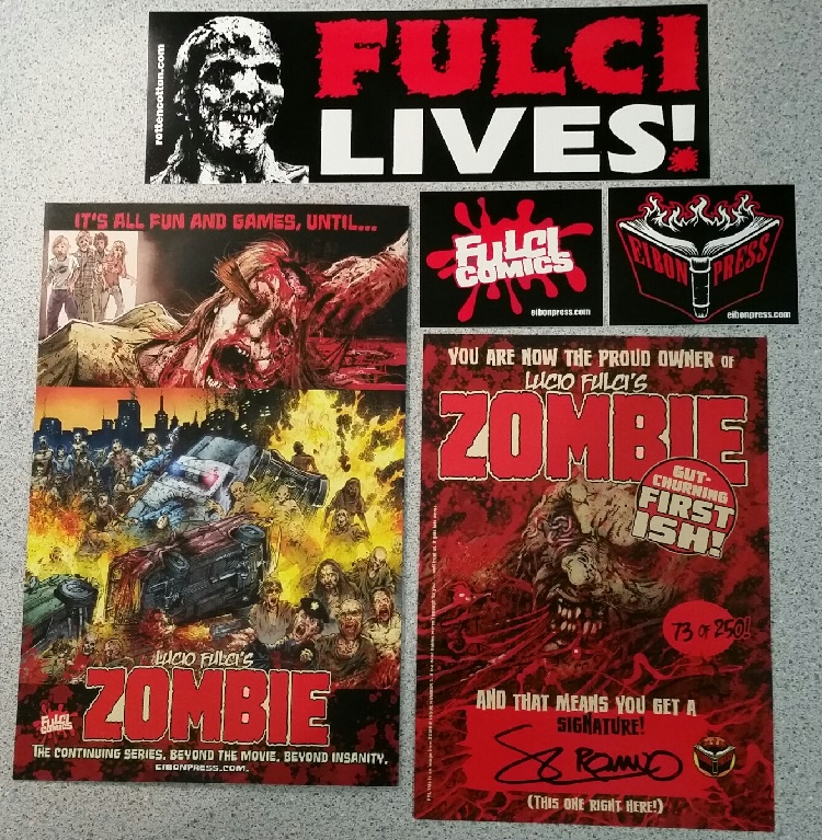 As if the low quantity and Fucli’s “brand recognition” were not enough of an incentive to purchase the issue, the creators were clever enough to appeal to the sensibilities of collectors by including stickers, a flyer, a bumper sticker, and (for those lucky enough to get a limited edition signed copy) even a mini print signed by Romano. While not necessarily high-end collectibles themselves (excluding the signed prints), these add-ons made what was a nice collector’s piece into more of a “must-have” for Fulci fans and comic collectors alike.