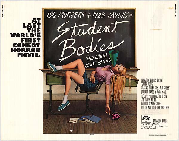 When I was around 14 or 15 years old, Halloween fell on a weekend. Since I was too old to go trick-or-treating, and I was not nearly cool enough to be invited to a Halloween party, I spent my evening doing what any red-blooded male would do in a similar situation – channel surfing through the premium cable stations looking for some spank material. Cinemax wasn’t showing their usual softcore European porn/sex comedies until very late in the evening, but HBO had a horror movie called Student Bodies playing at a more reasonable hour. I’d never heard of it, but horror movies of the era were always good for at least a few bare boobs, so I figured it would be worth the watch. It turns out the movie was more than worth the watch, and has actually become one of my favorite films, although SPOILER ALERT: There is nothing worth jerking off to in this movie.