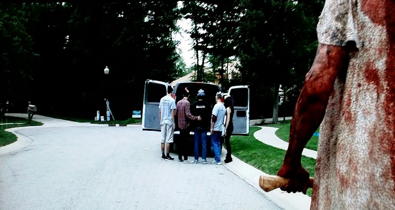 Danielle is carried by Will to the van and placed in the back. The group leaves the scene and drives to the warehouse. As they prepare to pull away, the killer can be seen walking into the scene from behind them. While no face is shown at this point, the body is. This is when we first learn that our killer is female. She is dressed in what appears to be a blood-stained nightgown and carrying an axe.