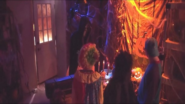 A young girl and boy ignore the warning and venture onto the farm. They reach the barn, the double doors looming large in front of them. A single jack o’lantern sits out front. The boy, heeding the pastor’s warning, is too scared to approach. The girl is not. Following the fateful directions of the folktale, the girl knocks 3 times on the barn door and says “trick or treat” for each knock. The doors slide open and fog pours out. 3 figures emerge from the bright light emanating from within the barn. Before the girl can even squeak out a word, the business end of a large pick-ax is slammed into the top of her head. Blood sprays from her skull like a fountain while the young boy runs off terrified into the night.