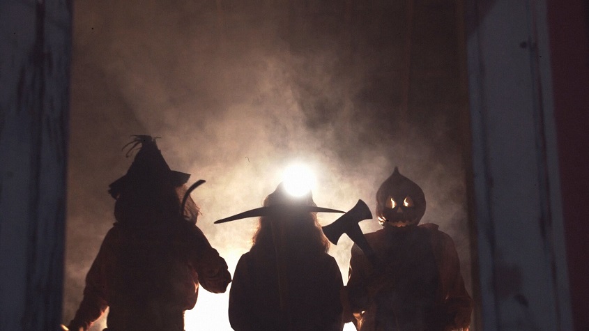 A young girl and boy ignore the warning and venture onto the farm. They reach the barn, the double doors looming large in front of them. A single jack o’lantern sits out front. The boy, heeding the pastor’s warning, is too scared to approach. The girl is not. Following the fateful directions of the folktale, the girl knocks 3 times on the barn door and says “trick or treat” for each knock. The doors slide open and fog pours out. 3 figures emerge from the bright light emanating from within the barn. Before the girl can even squeak out a word, the business end of a large pick-ax is slammed into the top of her head. Blood sprays from her skull like a fountain while the young boy runs off terrified into the night.
