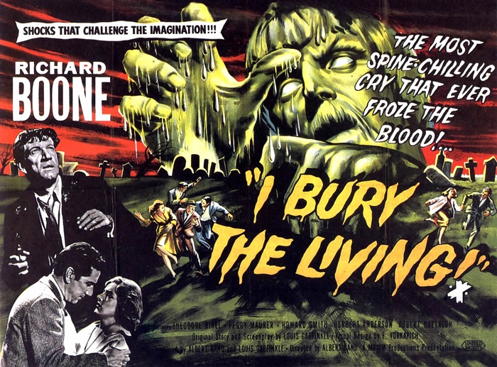 I’ve been a huge fan of I Bury the Living ever since I first watched the film about 10 years ago. It was included on a set of classic, black & white horror films that I had recently received as a gift. While the set was filled with legitimate genre treasures such as Nosferatu, Night of the Living Dead, & House on Haunted Hill, I truly believe that what the distributor really meant by “classic” was “public domain”.