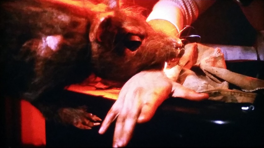 As for the monster itself, the body suit is bulky, yet still looks somewhat flimsy. That said, it’s still quite amusing to watch, if only for its inadequacies. That’s not to be taken as a total “slam” against the monster suit. God love ’em for trying and succeeding in creating something arguably screen-worthy. Credit goes to the creature’s creator, Thom Floutz, for having to crawl around on all four in the suit. I’m sure that couldn’t have been an overly comfortable experience.