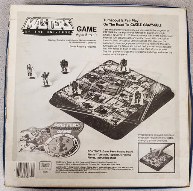 Packaged in a box featuring a Battlecat-mounted He-Man mid-battle with arch-nemesis Skeletor on the cover, the game itself comes in 3 separate sections: A colored plastic game base, a printed cardboard game board, and a clear plastic turntable. The game board is placed on top of the plastic base, and the turntable placed directly on top of the game board.