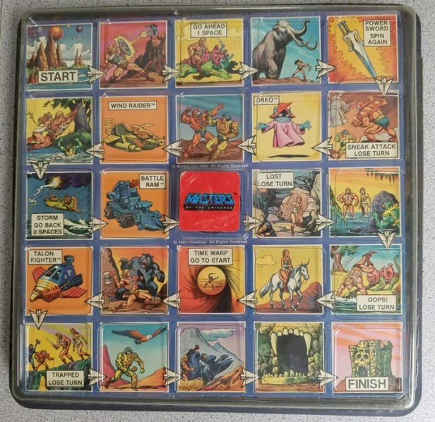 If a spin lands the player on a square occupied by a player piece of the other faction, they are forced to “battle” for possession. For example, if a player using “He-Man” lands on a square occupied by a player using “Ethel”, both players will spin the spinner once, with the player spinning the lowest number returning to the game’s starting spot.
