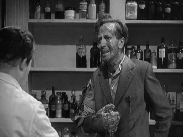 As one mystery begins, another more deadly and sinister event threatens to take shape. Victor Carroon, the lone surviving astronaut, is being monitored at a medical research facility, while also being watched over by his wife (Margia Dean), who is always at his side. Little does she know that Victor is slowly undergoing a physical metamorphosis that scientists cannot explain. Desperate to find treatment for her ailing husband, she arranges to have him secretly taken from the research facility and into a waiting car outside. The joy of rejoining her husband turns to terror when she discovers that Victor may no longer be the man she once knew. Already showing signs of physical mutations, Victor escapes from the vehicle while his wife screams out into the night.
