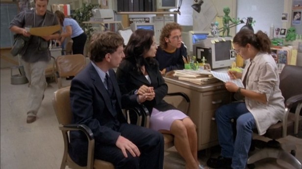 While Marci may be much too willing to believe the couple’s claims unquestioningly, her editor is not. He sends the “aliens” on their way and berates Marci for wasting his (and her) time with such nonsense. He orders her to cover the recent shuttle launch instead, as well as the experiments that are to be conducted on the spiders aboard the craft. Convinced that she is truly on to something “big”, Marci disregards her editor’s orders and heads out in search of the compound. Her cameraman, Slick, and researcher, Jake, join her for the voyage.