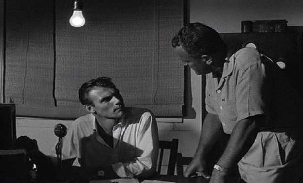 The plane starts to experience severe turbulence and radios into a small weather station near the island. TV’s “Batman”, Adam West, makes his film debut as the guy operating the weather station’s radio. The pilot reports extreme winds, but the weather station has detected no weather anomalies. It’s actually been a beautiful, clear day by their observations. The plane lands anyway.