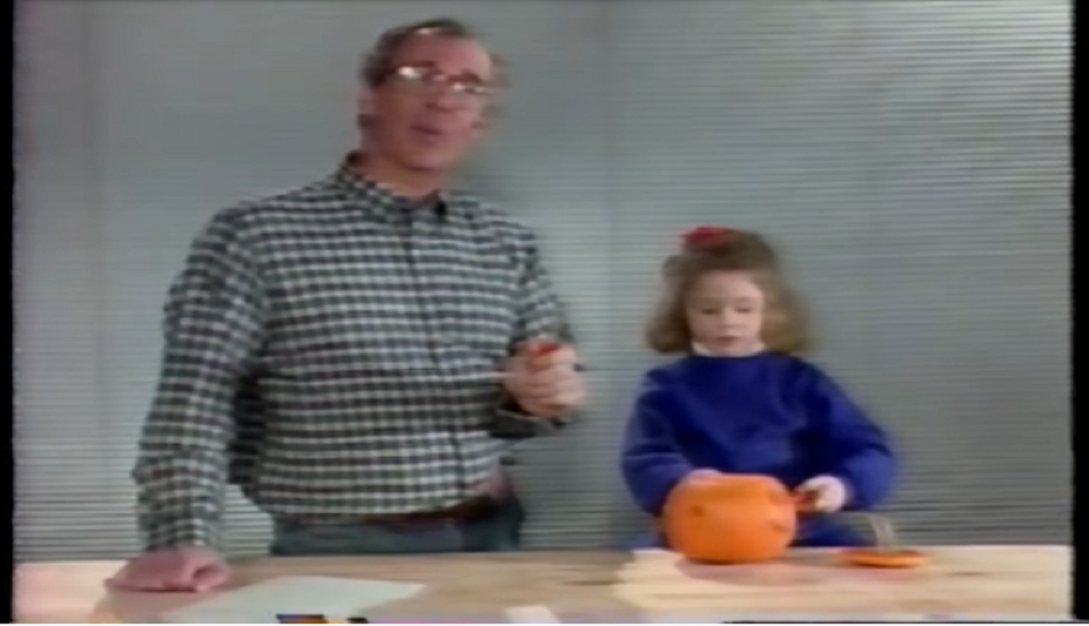 Where as most VHS tapes open with the obligatory “FBI Warning”, “How to Carve Great Faces for Halloween” opens with a warning advising children not to handle knives without adult supervision, and to exercise caution while handling knives. Knives, as you may be aware, are dangerous, and may potentially hurt or even kill you or those around you when not handled properly (or in most cases, when handled properly). One would think that this is self-evident, especially as the purpose of the knife is to cut fleshy chunks out of the pumpkin. However, as we live in a world where we need warning labels to inform you that your hot coffee is indeed hot, the producers and distributors of this video presentation would like for you to know that in the circumstance that you do injure or kill yourself or others, they are not responsible. Not in the slightest, dumbass.