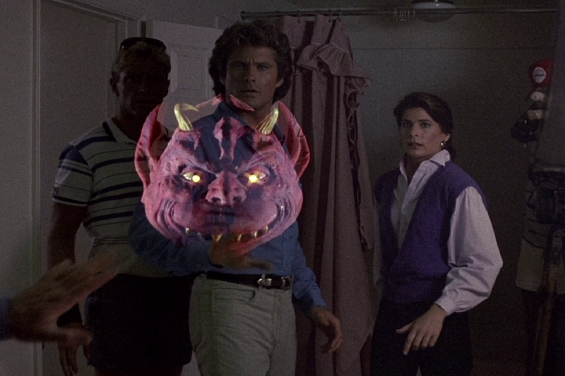 It’s not just Psycho references that will keep horror fans interested. There’s a cool hologram effect of a Little Rubber Monster head that projects onto a bathroom mirror giving the location of the Psycho house, a sexy witch (and her black cat) who wants to use KITT as her “Witchmobile”, a tour through a costume shop to look for a gorilla outfit with REAL gorilla hair (is that even legal?), and quite possibly the pièce de résistance of the entire episode… a Silver Shamrock pumpkin mask from everyone’s favourite Halloween movie… Halloween 3: Season of the Witch!