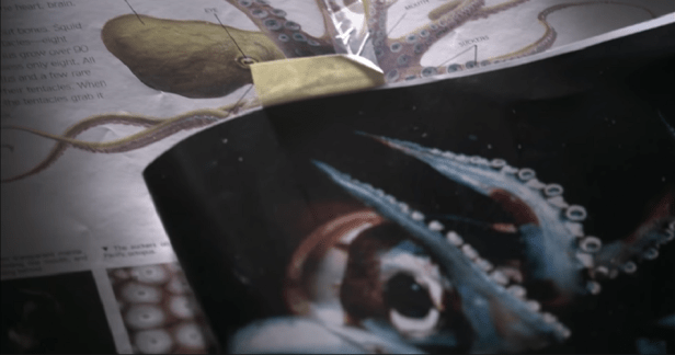 During Dan’s trip with Thorson, the teen boy is found floating alongside the shattered remains of his boat. The boy is pulled aboard, mumbling nonsensically about a monster before succumbing to hypothermia. Dan recovers a few pieces of the debris and notices a series of circular marks on them, similar to those left by the suckers of a large squid. He takes a few pictures before storing them in his bag. However, the pieces are soon stolen by one of Thorson’s crew.