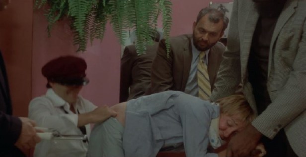 While on his “house/booty call”, a small gang of thugs visits his salon to speak with the new receptionist, Brenda (Tanya Boyd – Roots, “Days of Our Lives“); the former lover of a white crime boss, Mr. Wilson (Joseph Carlo, whose only other acting credit would seem to be Satan’s Cheerleaders). The men advise the young woman that it would be in her best interest if she returned back to that role. To ensure that she understands, the men also knock over a few shelves, as well as rough up Mr. Jonathan’s two homosexual assistants.