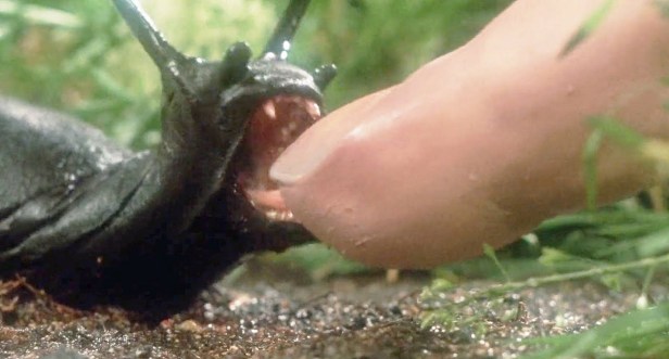 The local greenhouse is overrun with slugs and are chewing up the man who runs it when his wife walks in. She sees what’s happening, drops her cigarette in chemicals, and blows up the place real good. In one disgusting scene, the drunk politician’s wife cuts up a head of lettuce with a slug in it. She doesn’t notice it, makes a salad, and feeds it to him! Even cut up, these slugs are lethal, because the next day, he basically explodes in a restaurant full of people. When evidence is taken to the lab guy, he says “Oh, God! There’s no end!” How I wish he would have said “Yeah, baby!” after that.