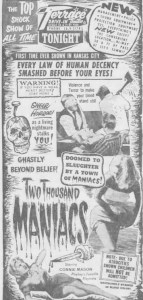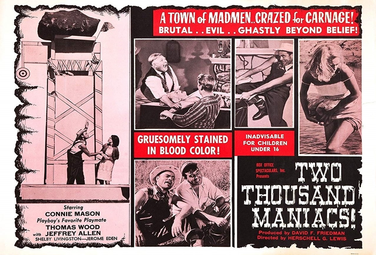 Glad to be back for Horror And Sons’ Halloween Horrors series, and I hope you all enjoy my look at 1964’s Two Thousand Maniacs from the “Godfather of Gore”, Herschell Gordon Lewis.