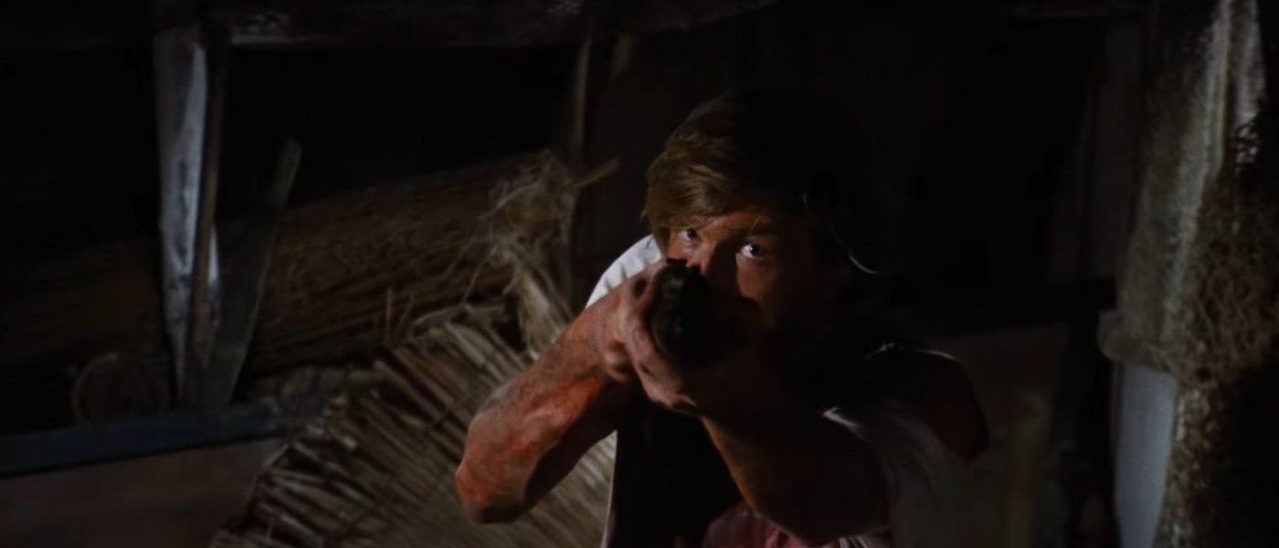 As we hear tribal drums in the distance, the film begins. A revolver points directly at the camera. A shrouded body on a bed rises, as it returns from the dead. A single gunshot rings out, resulting in a bloody head wound. A zombie has been neutralized. The wind blows. An indistinct figure stands motionless in the shadows. He intones to someone out of frame, “The boat can leave now. Tell the crew.” Then, suddenly, it’s thump, thump, thump as the score kicks in, with scratchy synthesizers soaring over a syncopated drum-machine track, as the credits arrive. For my money, this is one of the greatest opening scenes of any movie from any genre ever. It fills the viewer with mystery and dread, foreshadowing the horrors that will unfold. This is Lucio Fulci’s Zombie.